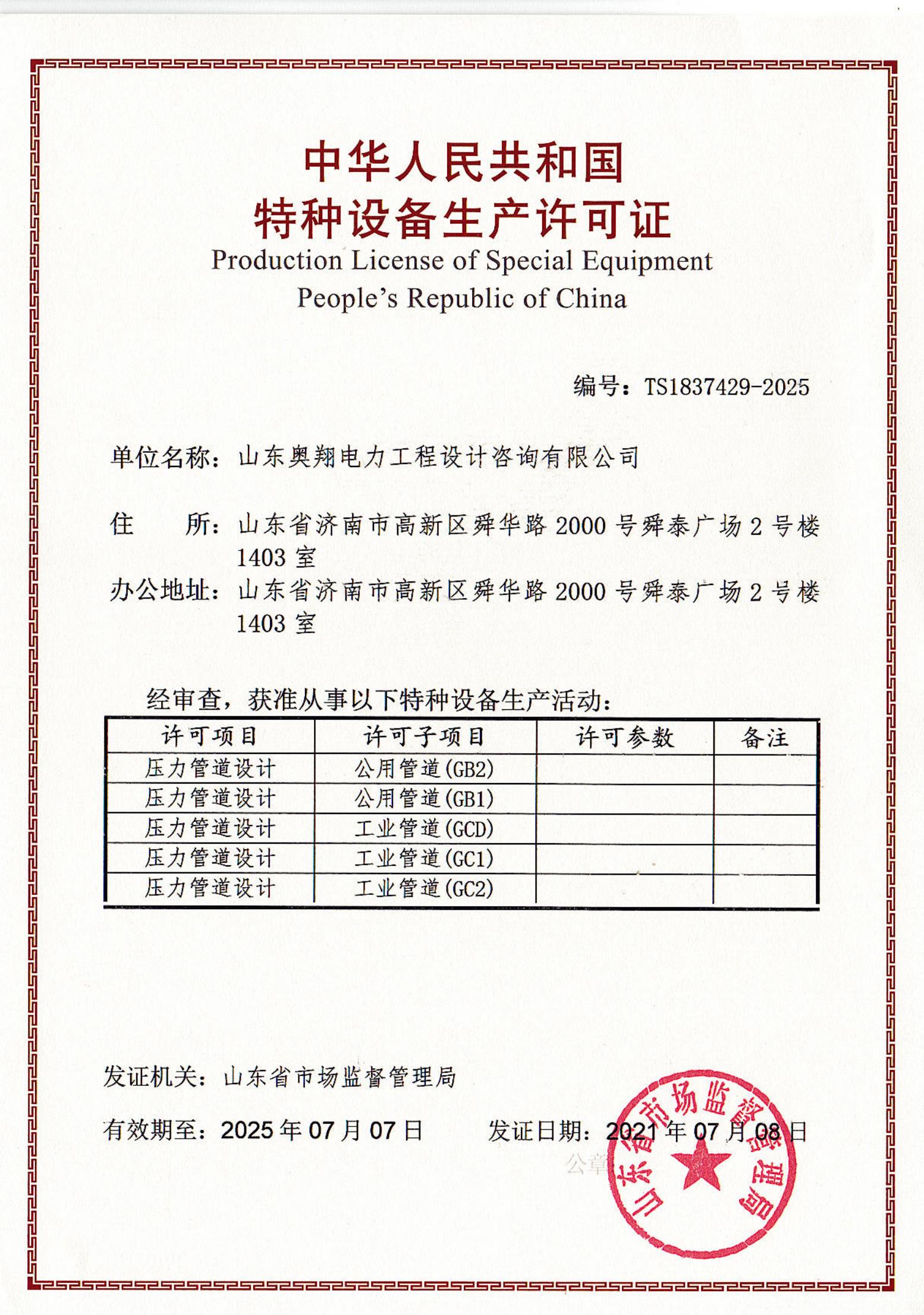 近日,在山東省市場(chǎng)監(jiān)督管理局最終審核后,山東奧翔完成了特種設(shè)備設(shè)計(jì)許可證書換證工作,實(shí)現(xiàn)了GB1,GB2,GC1,GC2,GCD級(jí)別壓力管道設(shè)計(jì)特種設(shè)備許可證的延續(xù)。